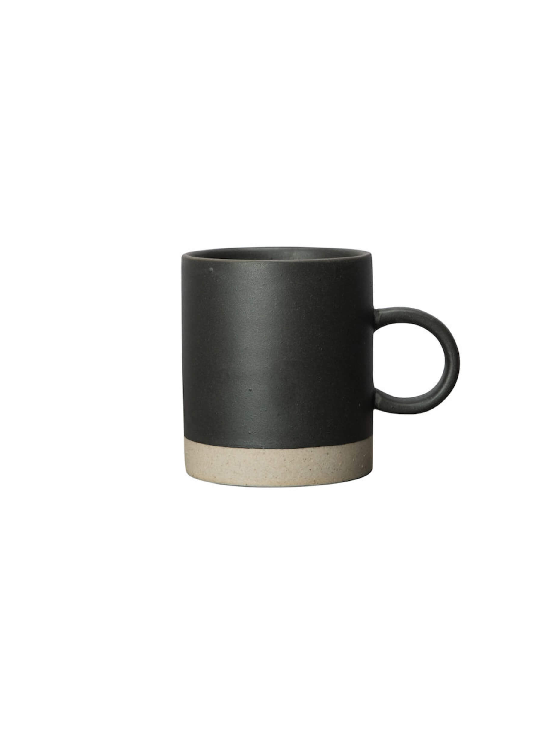 Krus av porselen i beige og svart.